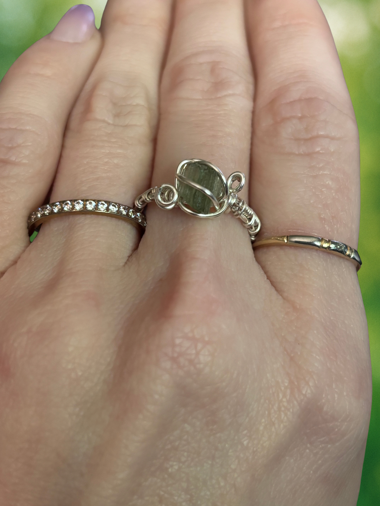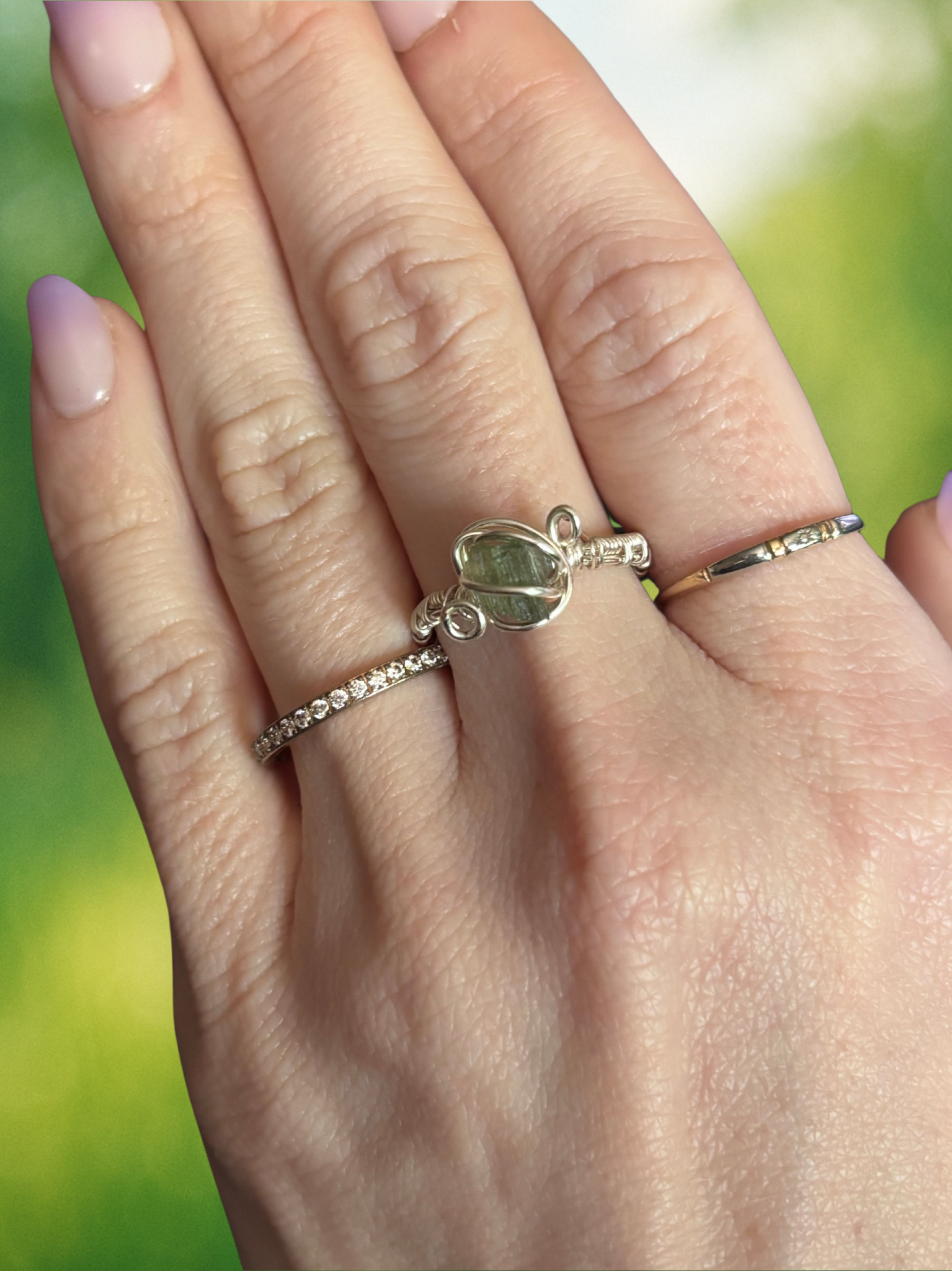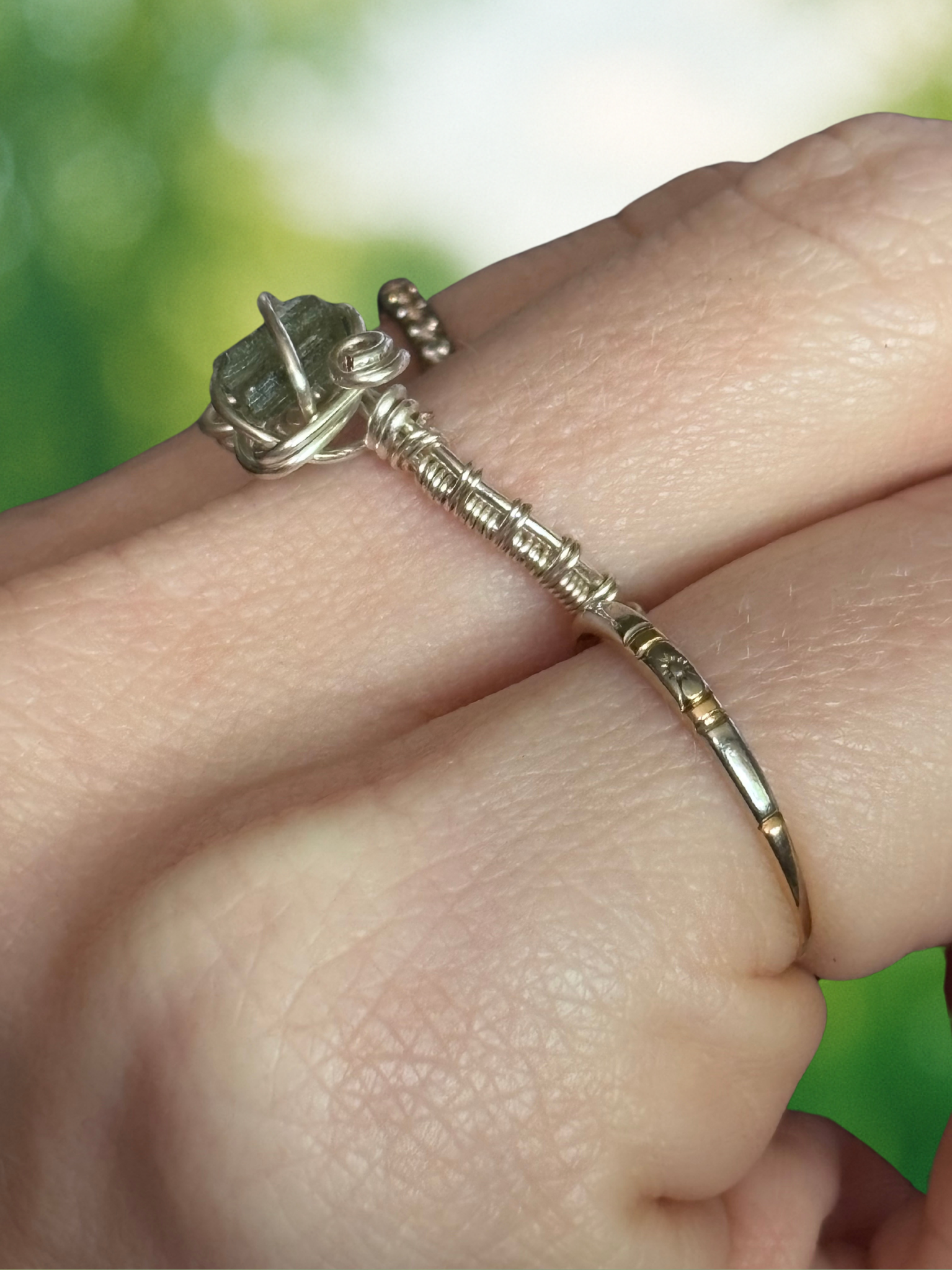 This unique ring features a raw Moldavite gemstone, carefully wrapped in tarnish-resistant silver-coated copper wire. The intricate wirework not only secures the stone but also enhances its natural beauty, creating a harmonious blend of earthly craftsmanship and celestial energy.