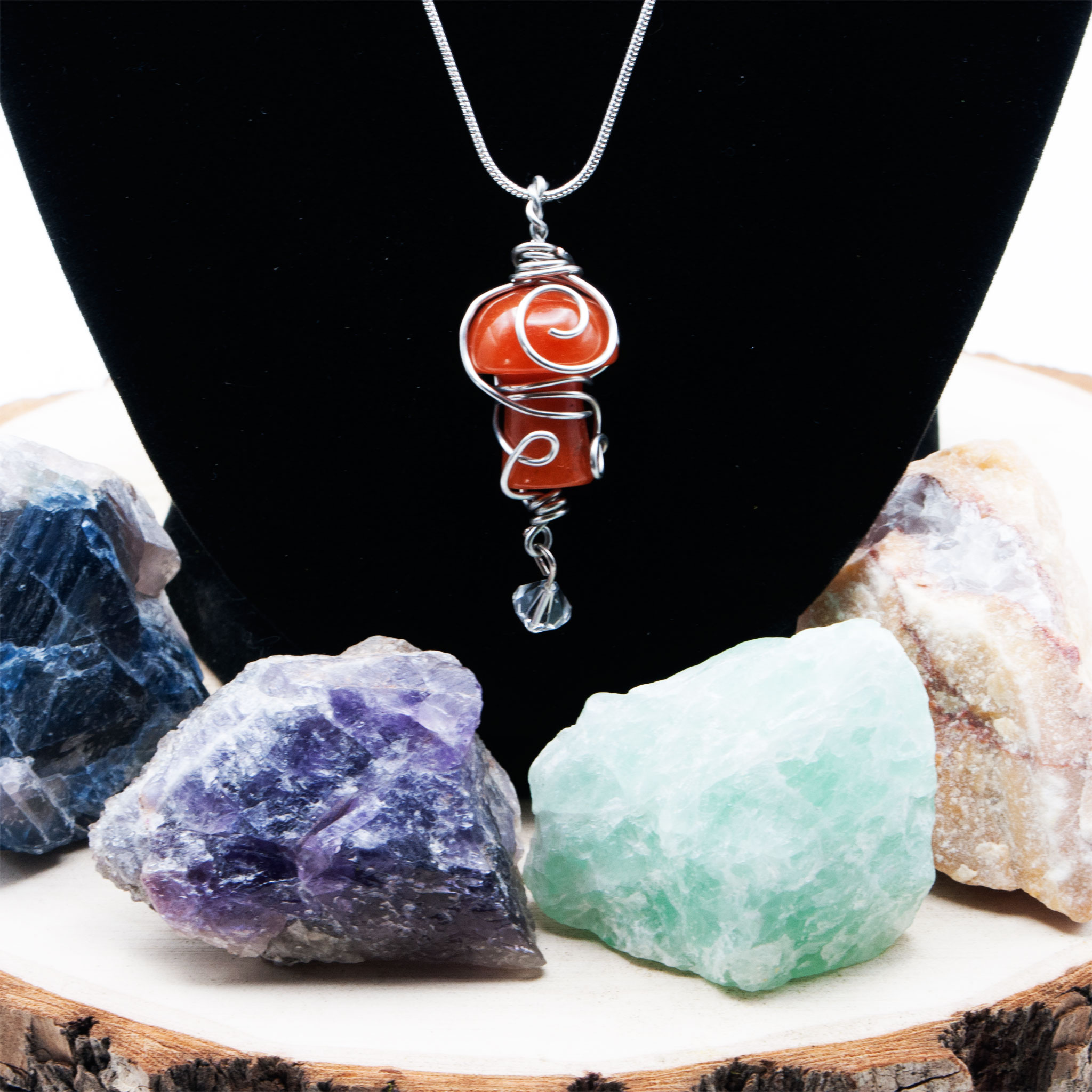 The pendant is expertly hand-wrapped in tarnish-resistant, silver-coated copper wire, its flowing spirals echoing the organic curves of a forest mushroom, ensuring both durability and a luminous finish that highlights the stone’s natural allure.