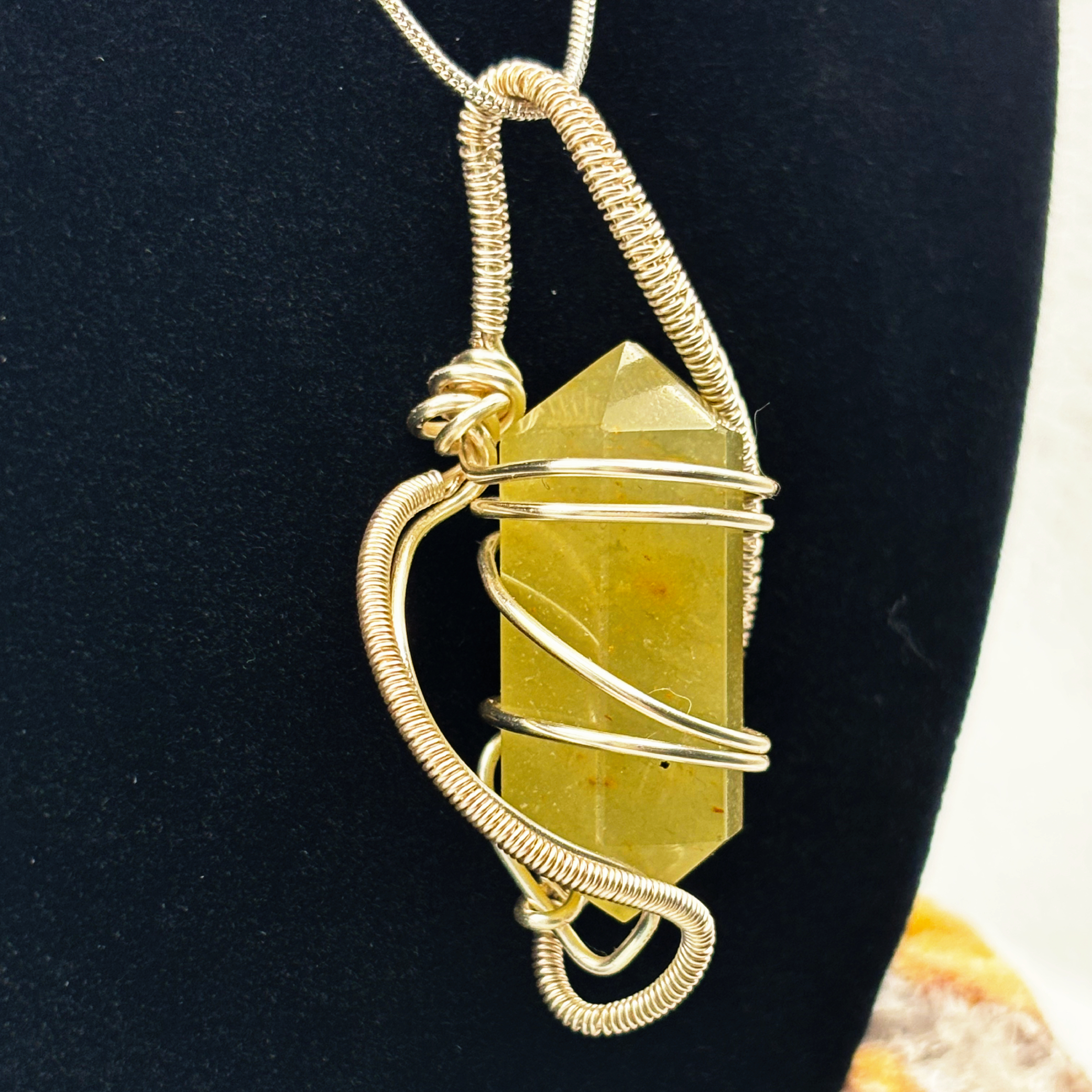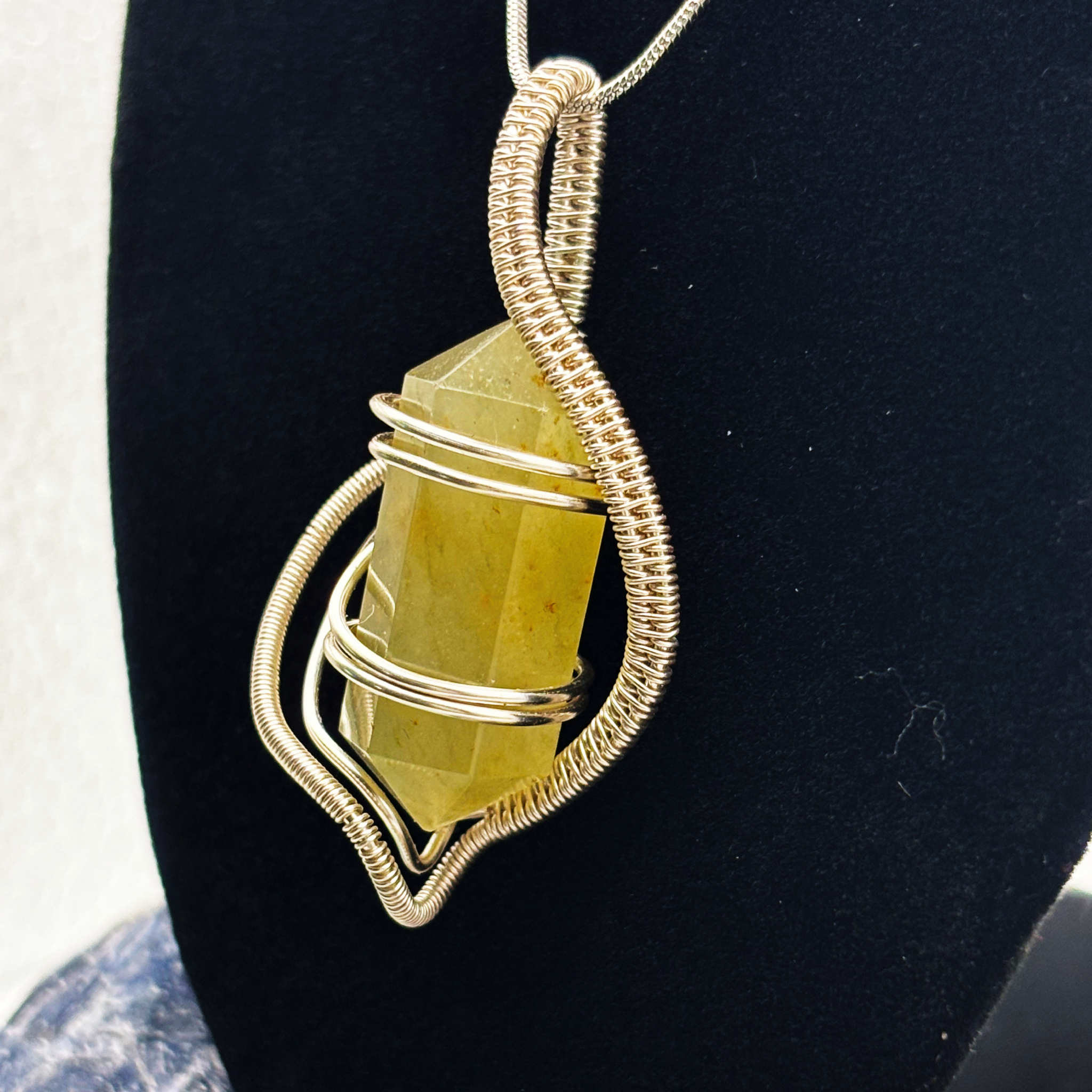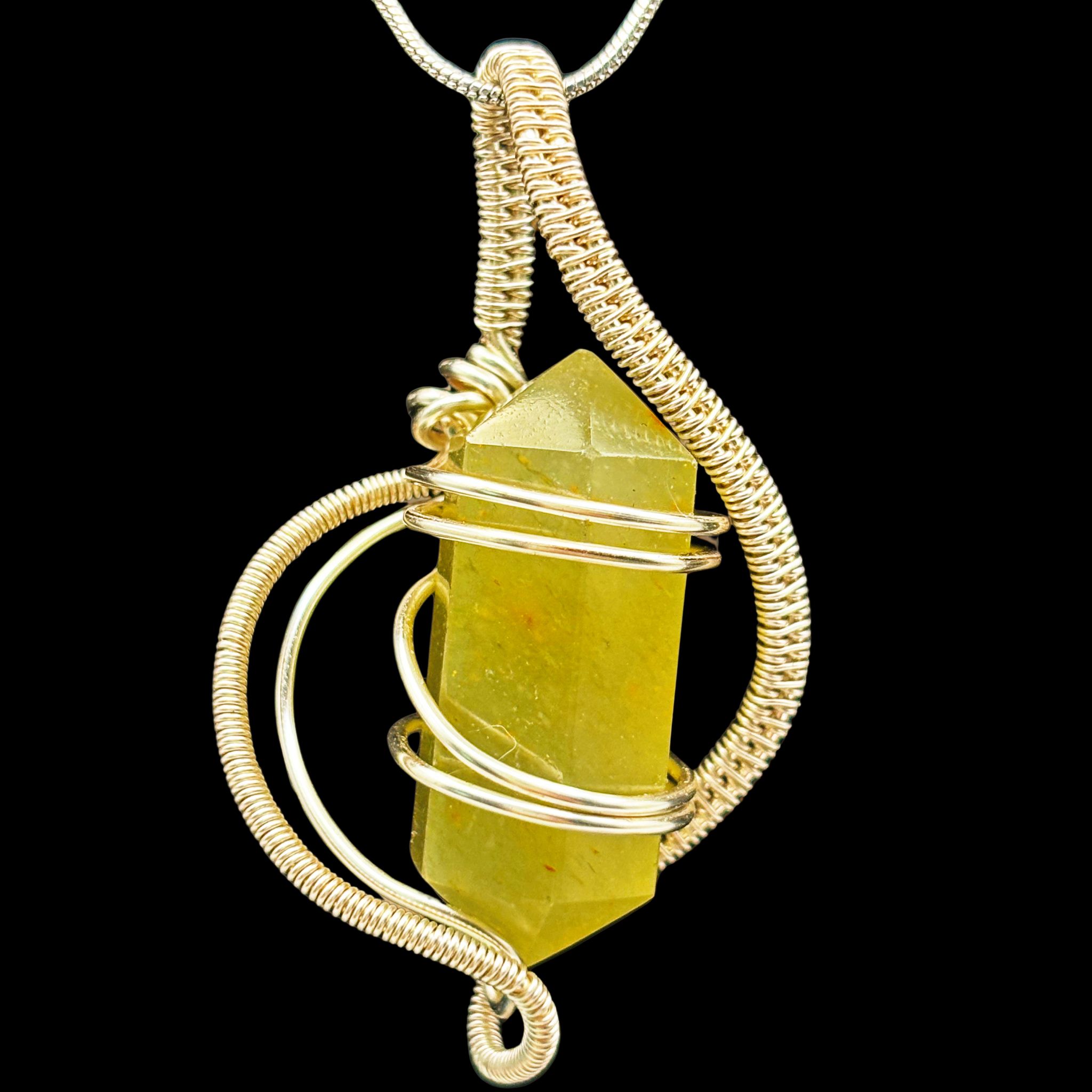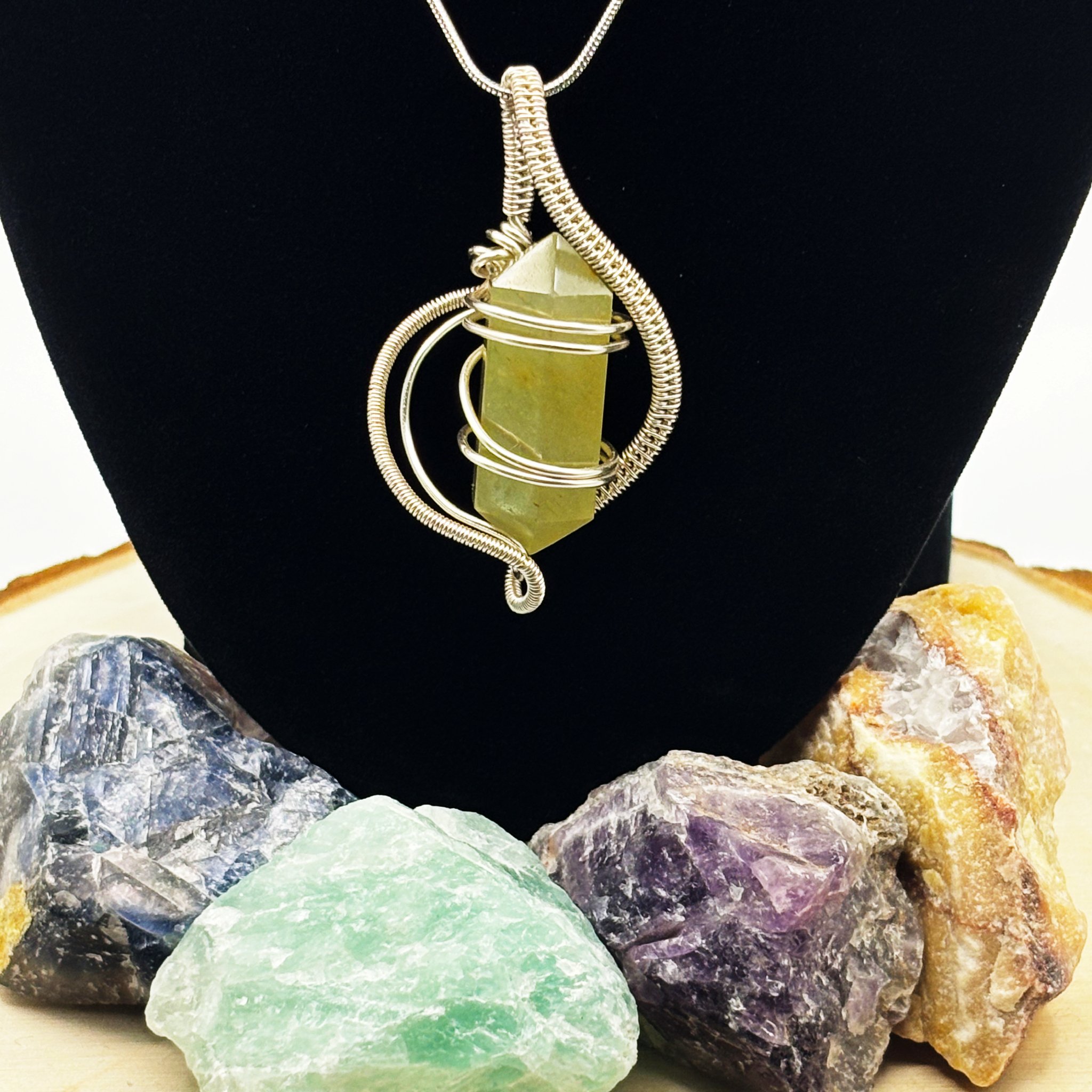 This pendant features a natural double-terminated Prehnite crystal, lovingly wrapped in tarnish-resistant silver-coated copper wire. The sleek wirework enhances the crystal’s soft green glow while allowing its natural form to take center stage.