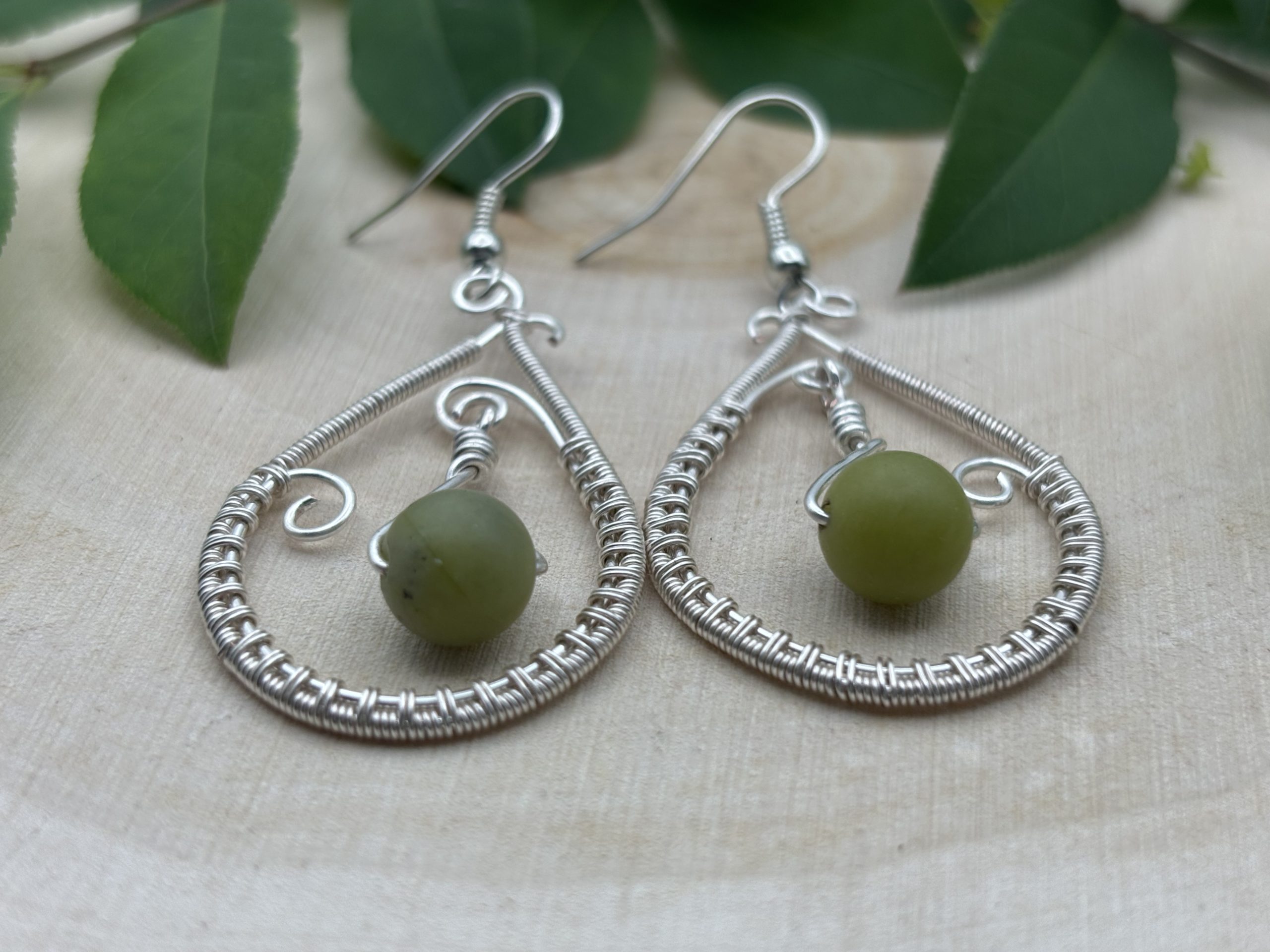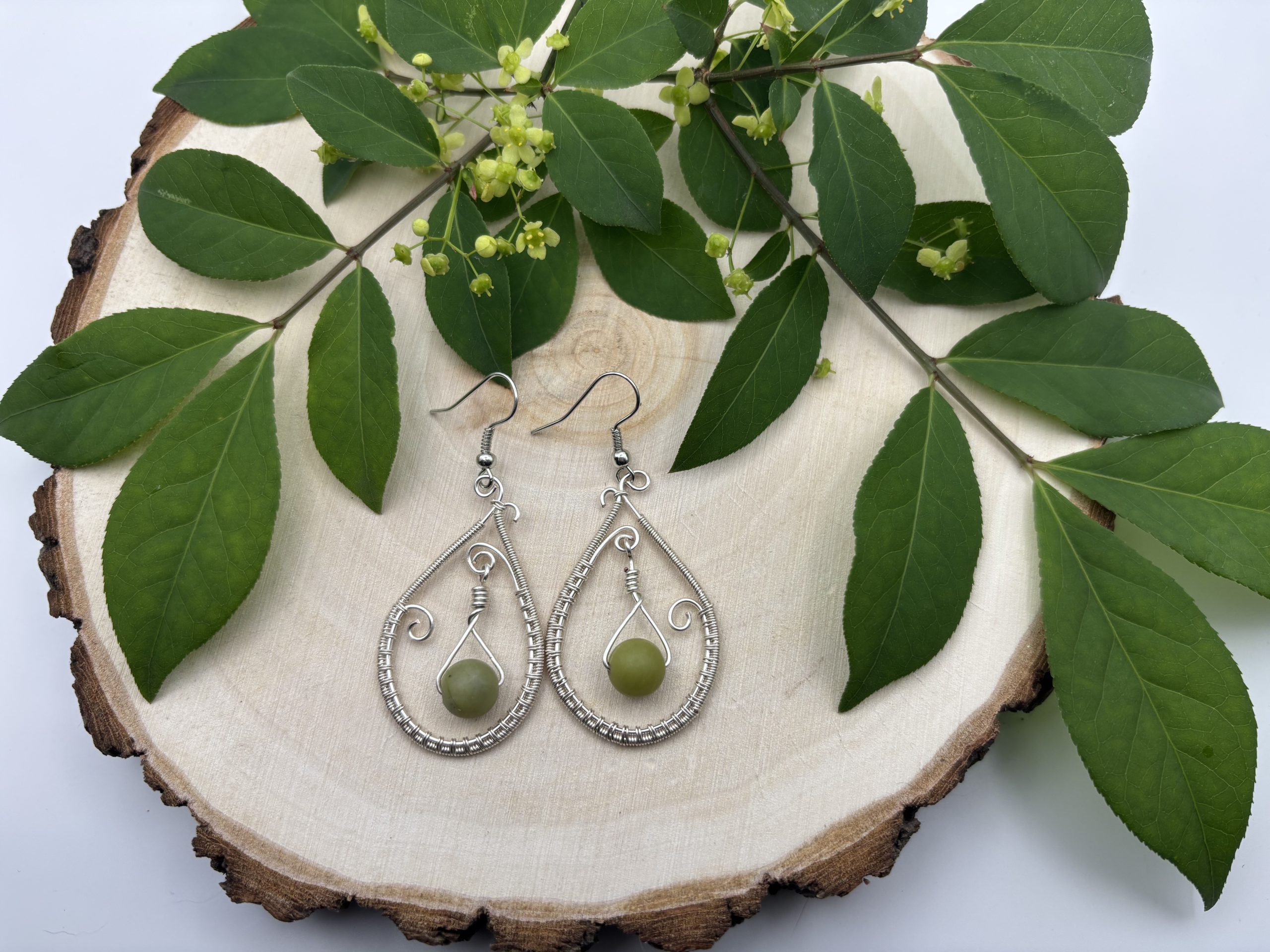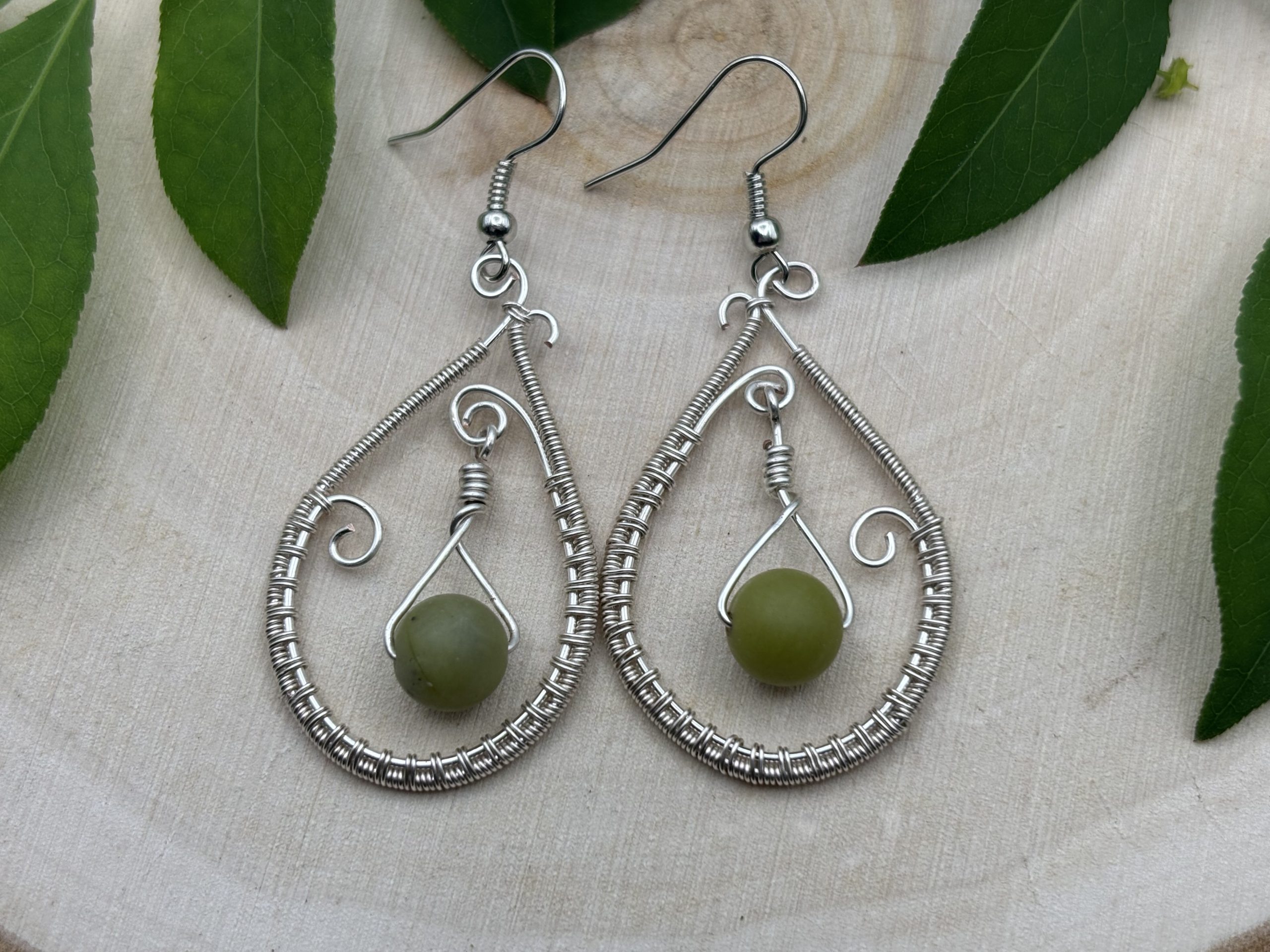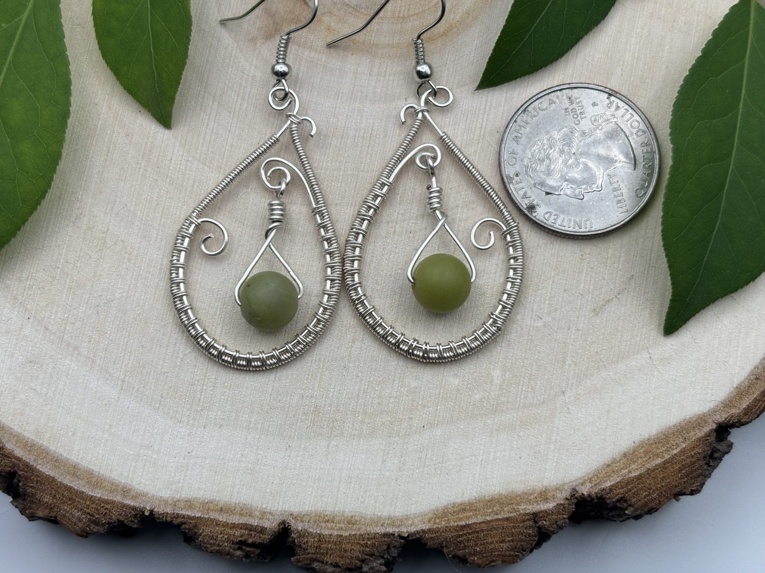 Enchanting wire-wrapped earrings with jade, a stone of harmony and abundance. Silver swirls frame its serene green glow. 1.5″ long, hypoallergenic hooks.